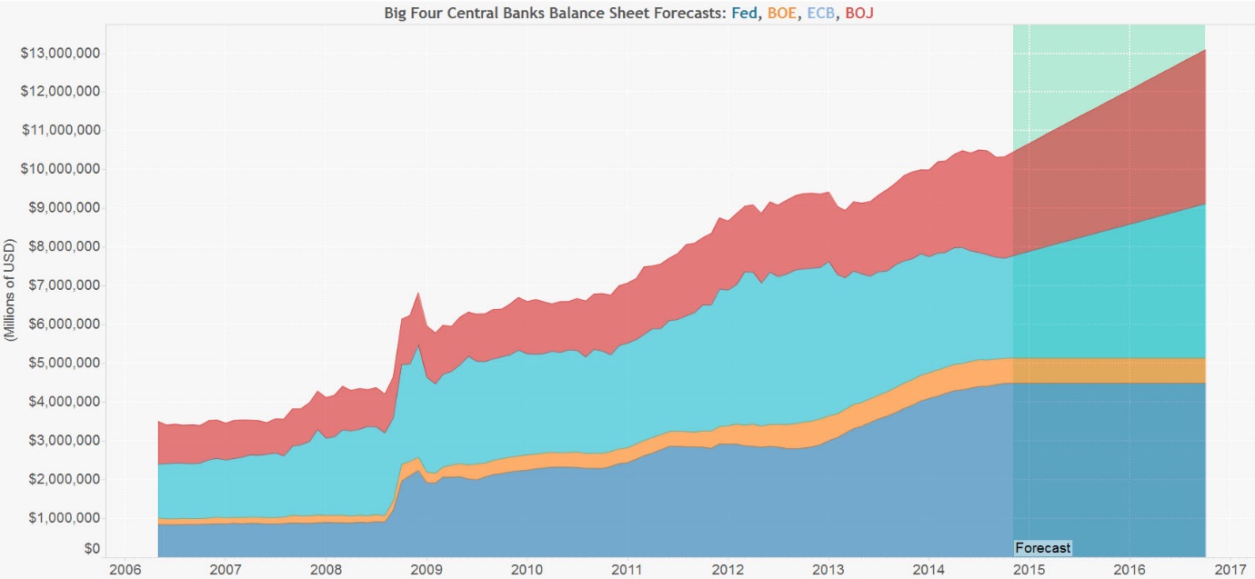 You can measure how much money is in the economy by looking at a central bank’s balance sheet. The amount of money in the economy corresponds to the amount of investments purchased and held there. That’s how we know how much money is being created – by the increase in central banks’ balance sheets.