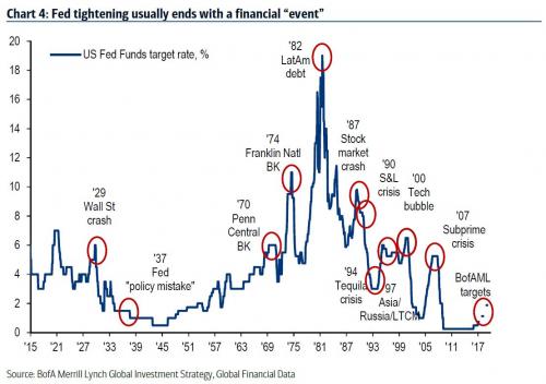 What of the investment implications of all this? Where this ends might be very simple. Look at the last 30 years. Each time the Federal Reserve raises interest rates, it ends in some sort of crash or crisis. More importantly, the height of each interest rate peak has been steadily falling since the 1980s.