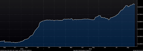 Thirty-year JGB bond prices are down 12.5% since July, when yields cratered at .05%. Thirty-year yields are now around 0.53%. Mind you, that’s not a huge yield. But it tells you that investors are behaving as if the Bank of Japan may no longer buy bonds to drag yields down across the length of the Japanese yield curve. Ten-year yields even made a brief attack on positive territory last week, rising to negative .02%. Nearly positive yields on ten-year JGBs! The madness!