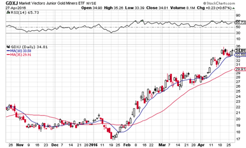 Junior gold mining stocks are acting like a call option on a weaker dollar. They’ve doubled since early February. If you have the stomach for them, they’re more exciting than bull riding or roller coasters.