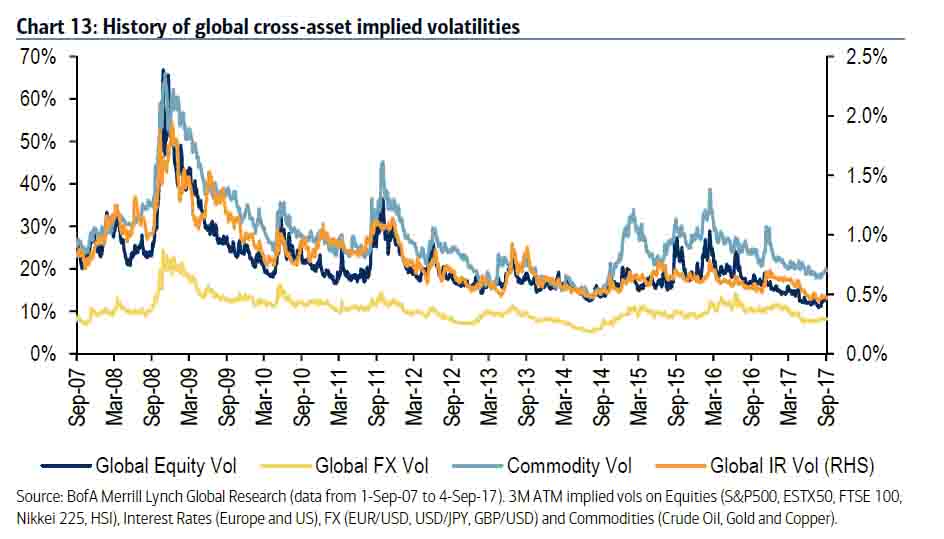 As Menon explained above, we’ve had plenty of bad events these last few years. But nothing seems to dent stockmarkets. Volatility is at extraordinary lows across all sorts of asset classes: