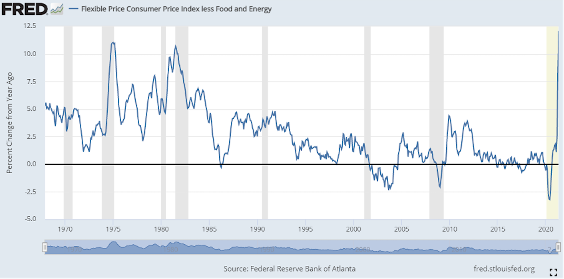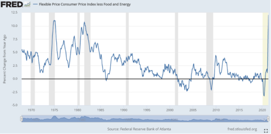 The surge in inflation so far hasn’t been particularly modest, by some measures and in some places. Cantillon Consulting’s brilliant Twitter page pointed out that the Federal Reserve’s Flexible Price Consumer Price Index less Food and Energy measure is already above 1970s peaks…