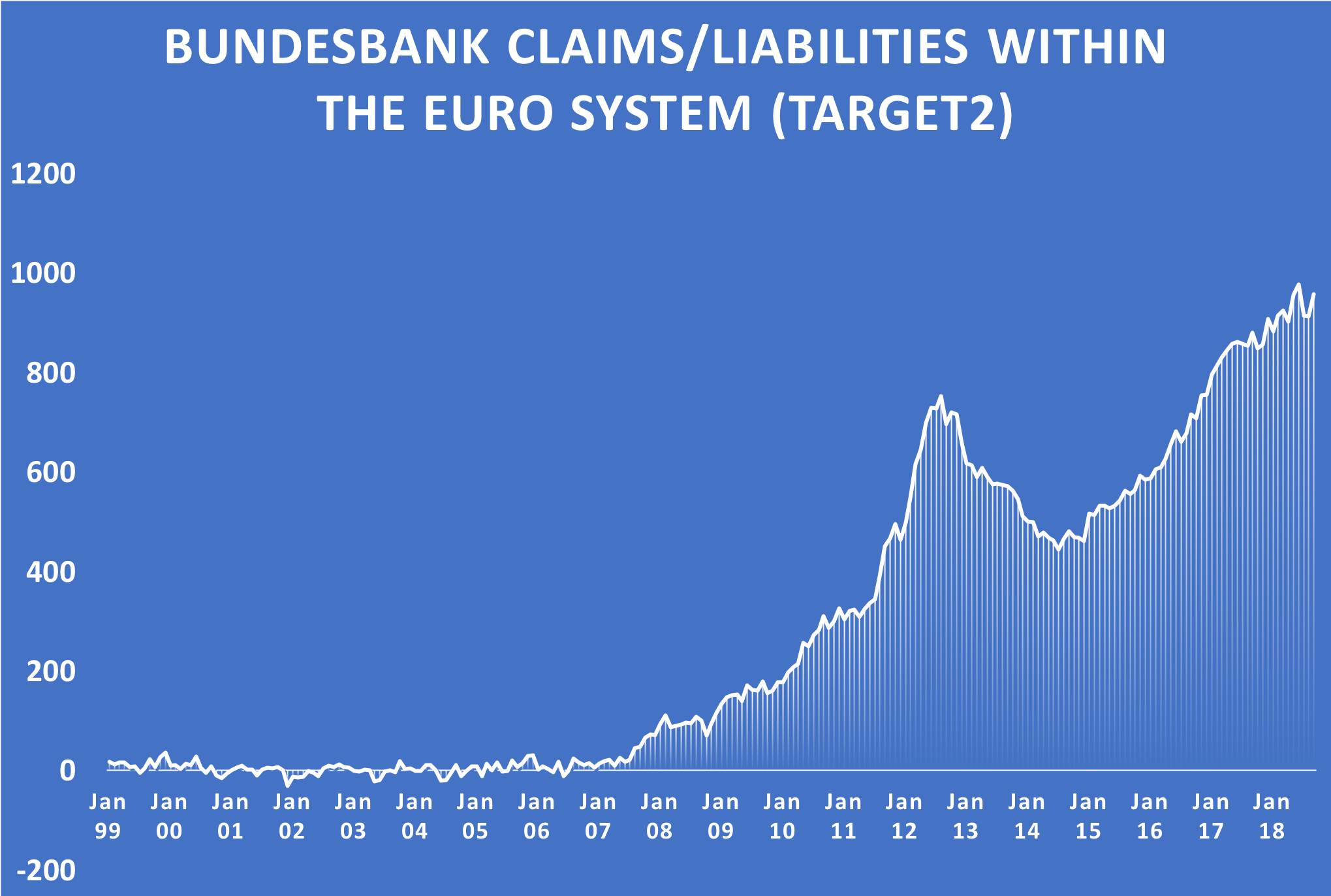 By the way, if you’ve only just joined us here at Capital & Conflict, that line is supposed to linger around the zero mark, and not zoom up. These are Germany’s surpluses accrued from capital flight into German banks from stagnant Euro economies in the south. Those surpluses are now closing on €1 trillion. The Italian graph is a mirror image of this, with a mountain of liabilities rather than claims.