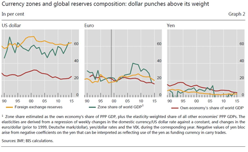 The dollar exerts a powerful gravitational force on other currencies, as judged from how currencies move in relation to each other. Based on statistical techniques that seek to tease out this effect, if one considers the euro and yen as the other possible reference currencies and uses GDP weights, the “dollar zone” was, again, around 60% in 2014, the euro was second at only 25% and the yen a distant third. This gravitational pull, in turn, has a deep influence on the denomination of countries’ assets and liabilities and, hence, also on FX reserve composition, as it determines a portfolio’s sensitivity to exchange rate fluctuations. There is a clear positive relationship across countries between these shares and the degree to which currencies co-move with the dollar.
