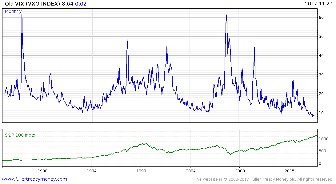 The VXO index, which is the market’s expectation of short-term volatility in the S&P 100, continues to wallow in the depths, moving opposite to the index itself: