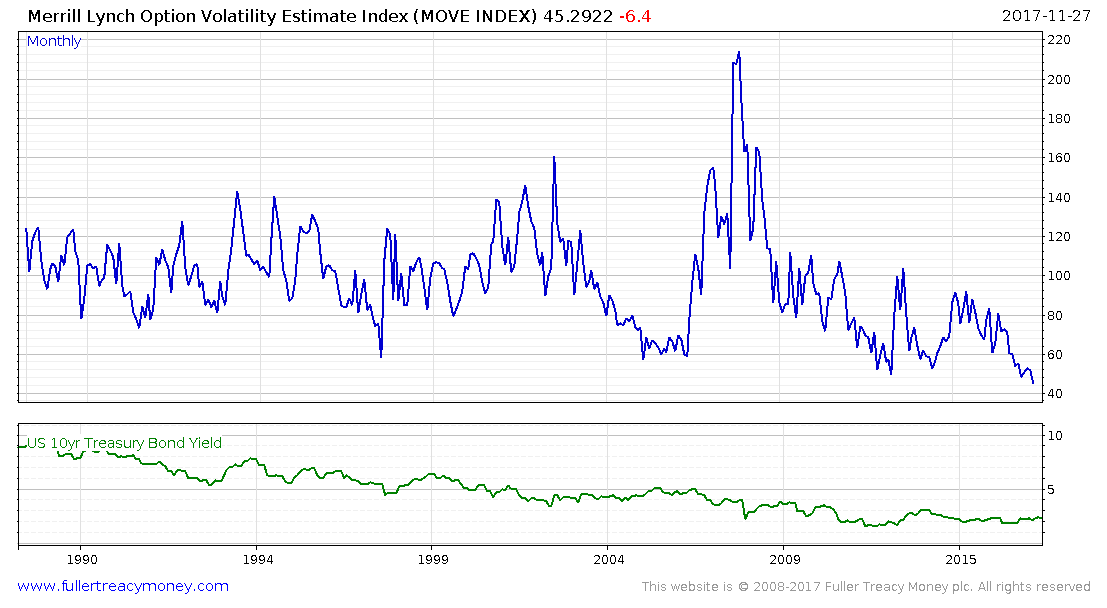 A similar story can be seen in the bond market. The Merrill lynch Option Volatility Estimate (MOVE) index is similar to the VXO, measuring expected volatility in US government debt. It too is at all-time lows – while US Treasuries have been in a bull market; as their price increases, the interest they pay to investors is crushed (in green).