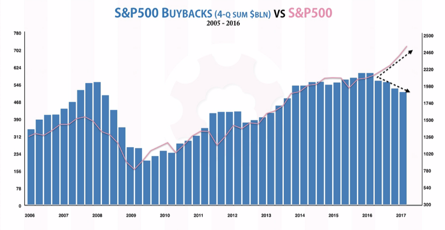 As you can see, the recent bull run in the market has been heavily supported by share buybacks… until recently. If the data is correct, the market is running on fumes. Nausea may come next.