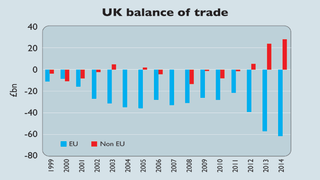 The failure to create jobs in the eurozone is a result of its policy choices. And this has a direct impact on Britain. Today, we have the widest current-account deficit since records began. Our trade with the EU has been a significant contributor to that – since 1999, British exports to the EU have grown by 3.6% a year, whereas our imports from the EU have grown by 4.7%. That 1.1% gap doesn’t sound like much, but compound it since 1999 and it means Britain now has a £61.2bn trade deficit with the EU, as the chart shows.