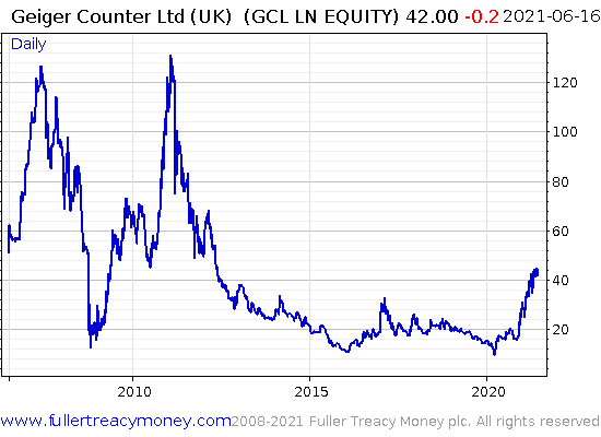If we look at the UK-listed and aptly named Geiger Counter fund (ticker: GCL) which invests in the exploration, development, and production of uranium, you can see that demand for the sector from investors has increased significantly over the past six months: