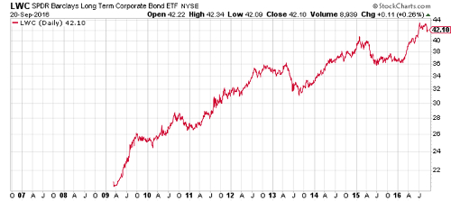 The chart above, by the way, is a Barclays exchange-traded fund (ETF) designed to track a long-term corporate bond index. I include it here for illustration purposes only. And how good was the timing!? Wall Street came along with a new investment product at precisely the time interest rates were going where no rates had gone before (to 5,000 year lows and even negative)!