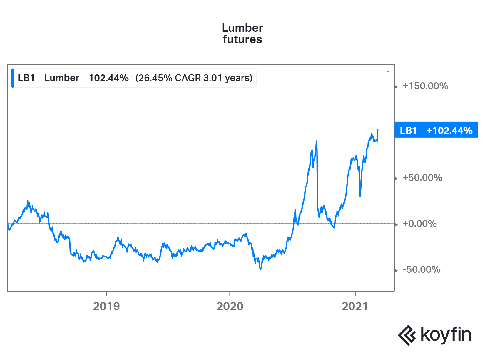 There’s a similar case to be made with the likes of lumber, which has boomed extraordinarily in price over the past year: