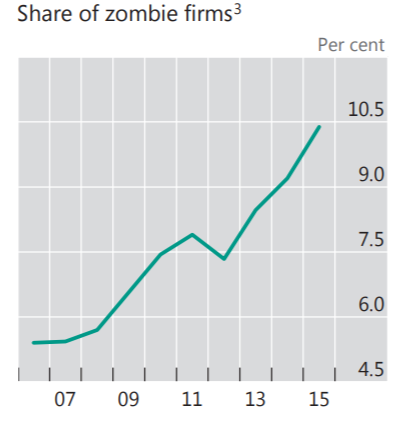 The BIS did the numbers for a selection of developed economies in June. Its definition of a zombie firm is one that is at least ten years old and can’t cover interest expenses at current interest rates. In other words, it’s a very conservative estimate.