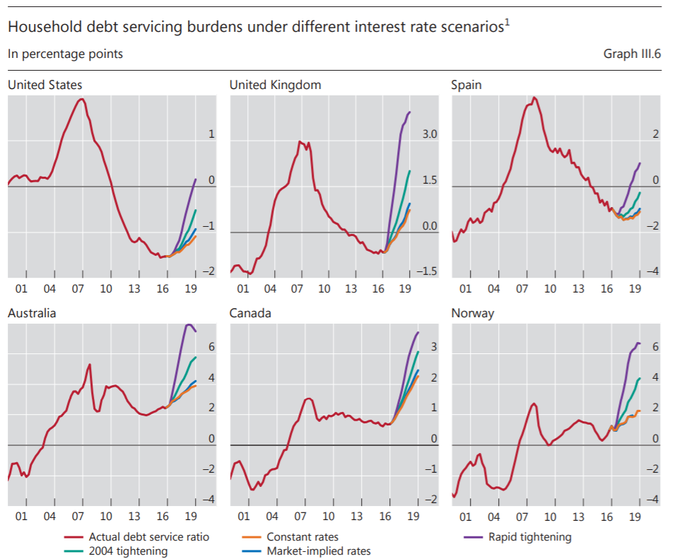 In its June quarterly update, the BIS modelled how a return to normal interest rates might look like in several countries. The charts show the proportion of income needed to service household debt.