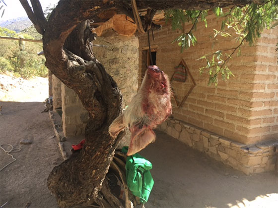 The animals of the area must want to hide when Easter approaches. Every family kills a cow, a goat, a sheep, or a pig. Sometimes, they kill one of each. Then, the carcasses are hung on trees.