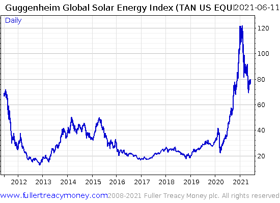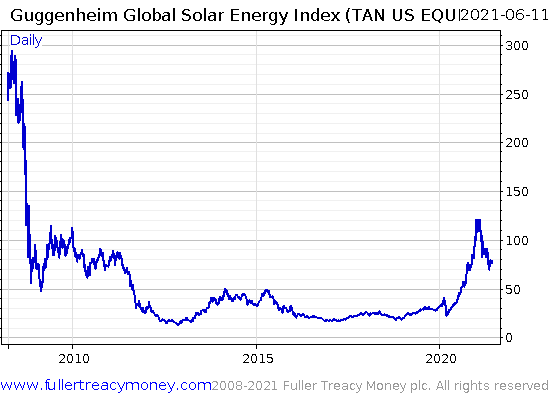 This is the aptly named TAN index of solar energy stocks: while it remains elevated, its sun has set somewhat: