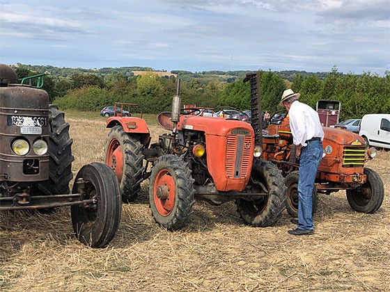 Then, one of the old-timers hooked it up to a long belt, which was attached to the thresher. The machine was about the size of a mobile home, outfitted with belts, pulleys, wheels, chains, cranks, pistons, and all manner of mechanical wonders.Bill examines the old French tractors