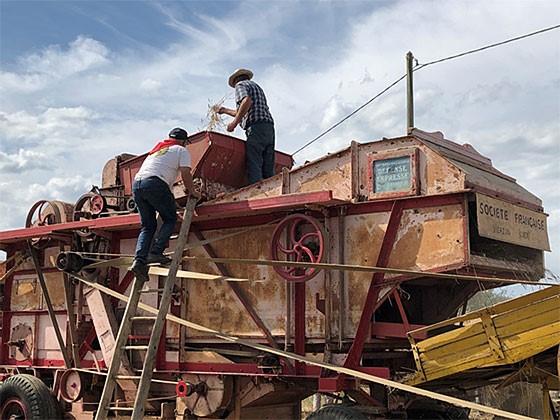 You had to beat the dried plant with flails; that is, you had to give it a good thrashing to shake loose the wheat from the straw. Then, along came the mechanical thresher (the batteuse here in France) to make the process easier.