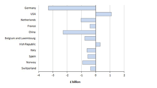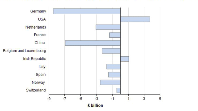 The charts below from the ONS report show one-month and three-month trade balances with “significant partner countries”. Check out the surplus with the US. Check out the deficit with Germany. The eurozone clearly favours German and French manufacturing. It does not favour UK service exports.
