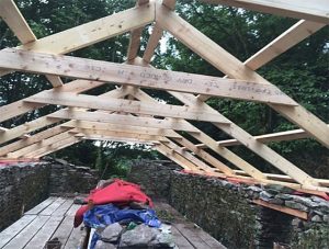 Another feature of this Irish barn is that the gable ends – not shown in the photos I showed you previously – will be built up, in stone, above the roofline, with the edges of the tin embedded in the cement. This keeps the wind from getting under the roof and prevents the roof from drifting from center.