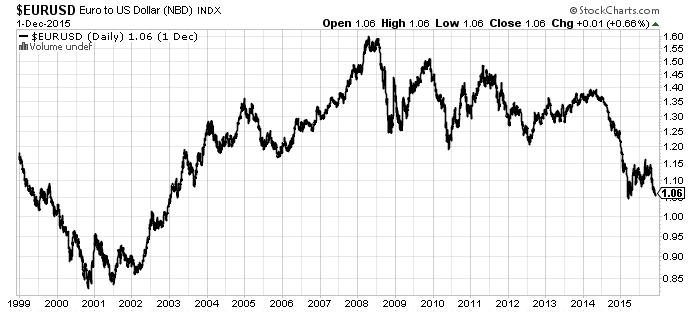 At the currency level, anything other than a big âeaseâ could see a rally in the euro. Check out the chart below. Interest rates in the eurozone and America appear to be headed in opposite directions. The ECB could go even more ânegativeâ on rates for excess deposits. Meanwhile, the US Federal Reserve is signalling anyone who cares to watch that itâs resolved to ânormaliseâ US interest rates.
