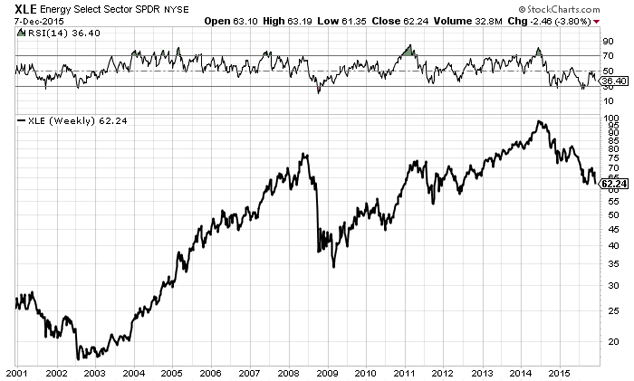 Speaking of which, have a look at the chart below. It’s a 15-year weekly chart of the S&P energy sector with the relative strength index above. Study it closely.