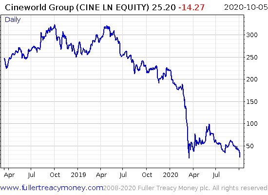New York is a rather exotic example though. How about cinemas? I knew a couple of folks who were buying Cineworld ($CINE) after March, expecting a return to normal and a strong recovery for the stock. But here we are, and the broad closure of Cineworld screens has brought the share back to the brink once more: