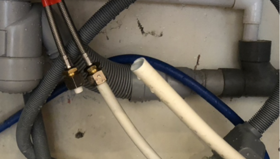 Ideally, Mr Hotwater Pipe, who you can see, would be attached – like his friend Coldwater Pipe – to the metal cable going into the tap.