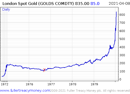 But it wasn’t nearly so straightforward. As you can see, while gold did jump high to begin with, there were entire years in the early 70s when the metal traded down. Those who’d wisely bought it fearing inflation were no doubt jeered at as being out of touch at the time.