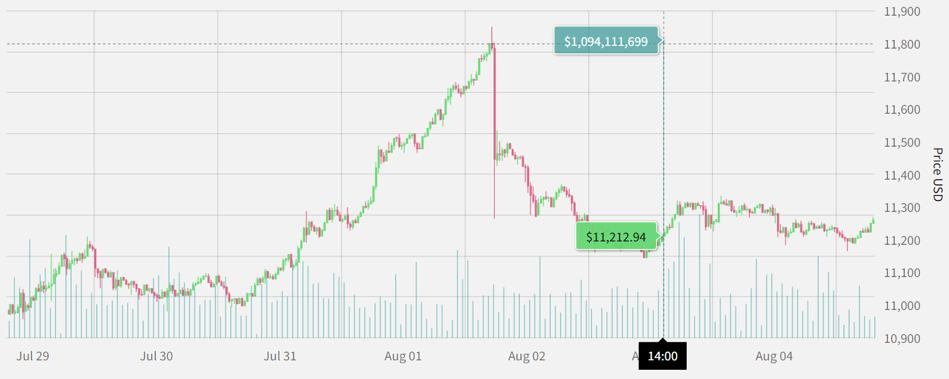 As you can see, on Sunday there was a cascade of selling in the BTC market (a lot of this was attributed to traders getting ahead of themselves with leverage). But the next day at 2pm, some $1.1 billion in BTC was spent in a short period of time.