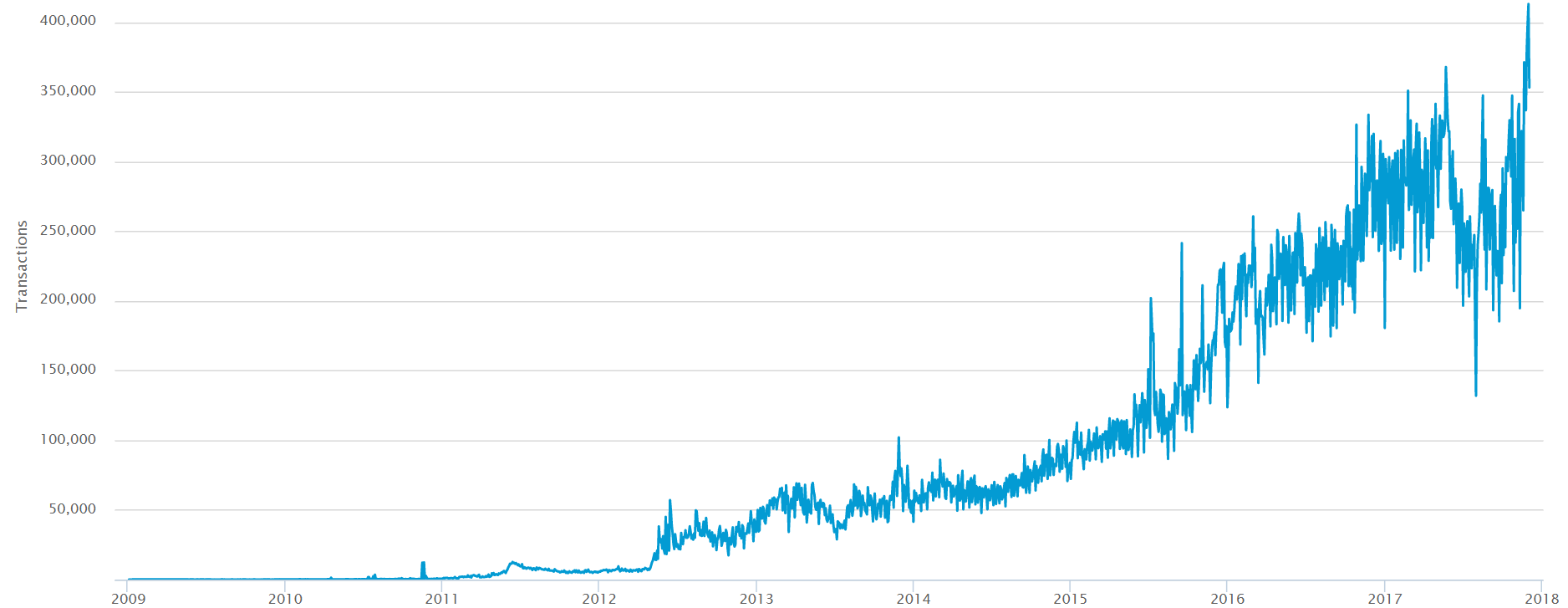 The number of transactions has been volatile, but not growing unsustainably. Remarkable given the number of vendors now accepting them, and the growth in wallets.