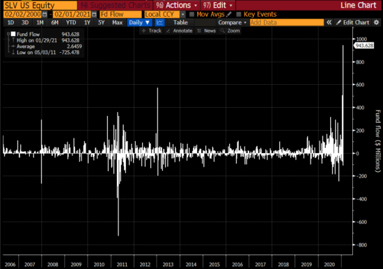 And when the markets opened, the silver ETFs received some major bids. Following sudden demand, the largest silver ETF – the $SLV – expanded by almost $944 milllion on Friday: