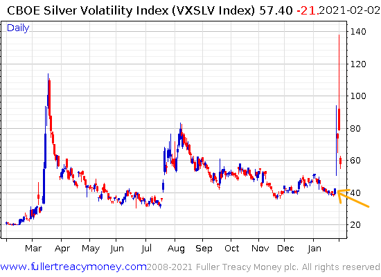 Note that massive spike which almost hit 140 on the index. That was on Monday – to illustrate just how massive an event that was for silver volatility, that’s the highest reading I can find on that index, going back 2011 (before the silver peak).