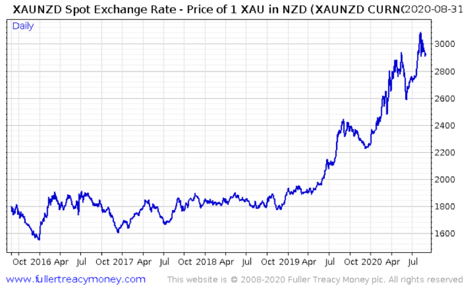 While gold made it to two thousand American dollars in recent weeks to much fanfare, for the Kiwis the “two thousand dollar” mark for gold is yesteryear’s news. Gold (represented by the currency symbol XAU in the chart below) hit two thousand New Zealand dollars (NZD) in April last year.
