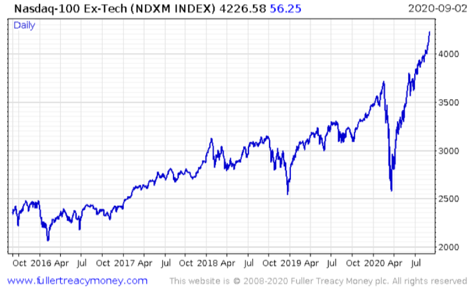 But it ain’t just tech names that are in the Nasdaq. There’s Costco, Pepsi, Starbucks and plenty of pharma stocks in there too. Strip out the tech from the index, and the performance is still extreme: