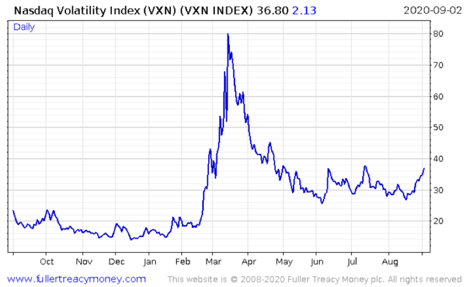 Remember the VIX index – that esoteric measurement of stockmarket volatility I wrote about in yesterday’s letter? One detail I neglected to mention is that the VIX only measures the perceived volatility of the S&P 500, another, more commonly referenced stock index than the Nasdaq.