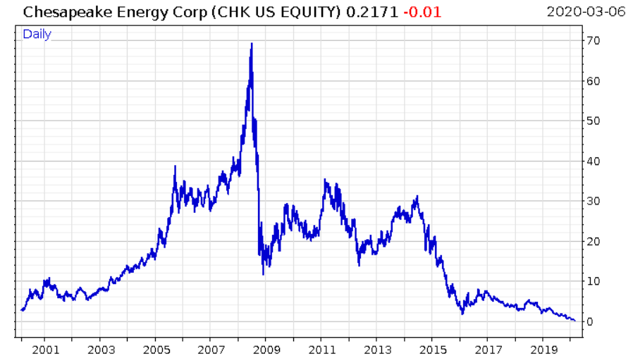 Chesapeake Energy Corporation ($CHK) is one of the frackers under significant strain. The stock was hit 75 bucks in the noughties – now it’s trading at 22 cents.