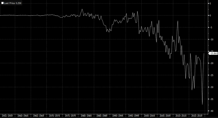 This was not always the case. For much of the period between about 1955 and 2000, the UK’s balance of payments bobbed around zero. Some years it was positive, others negative but generally it was trendless. That period was associated with growing prosperity because as productivity and living standards improved, so did consumption.