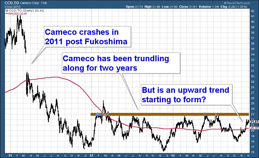 Above we can see the price action of Cameco over the last three years. You can see on the left the huge crash after Fukushima. Then for two years or more, the stock has trundled along in a range: $16-18 has marked the lows, and $23 (the brown shaded band) the top of the range.