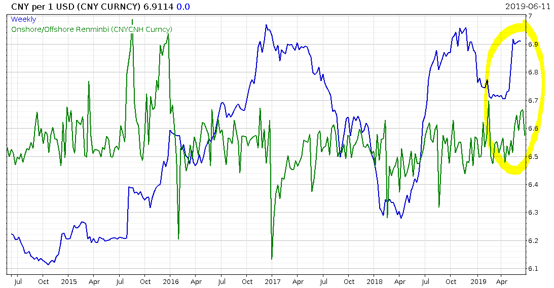 This pressure comes on top of the pressure for the Chinese government to devalue its currency, and remain competitive in the face of US tariffs. The yuan, or CNY, is now close to “cracking 7”, or being valued at 7 yuan per dollar, a key psychological level last seen in 2008. While the yuan is pegged to a basket of different currencies (a quasi-USD standard), it’s allowed to move within a certain range set by the People’s Bank of China (PBoC) each morning – a range which now allows the yuan to crack 7 without intervention.