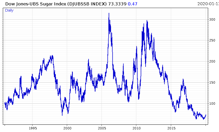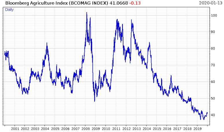 Indeed, pretty much everything that comes off a farm has been shunned in recent years. Here’s the Bloomberg Agriculture index: