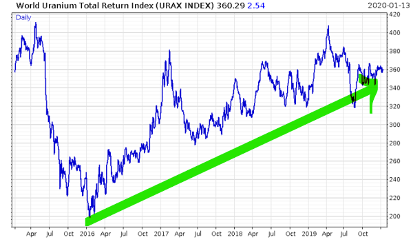 But it’s not just oil. Right at the same time, uranium follows a very similar path, recovering from the hatred it received after Fukushima: