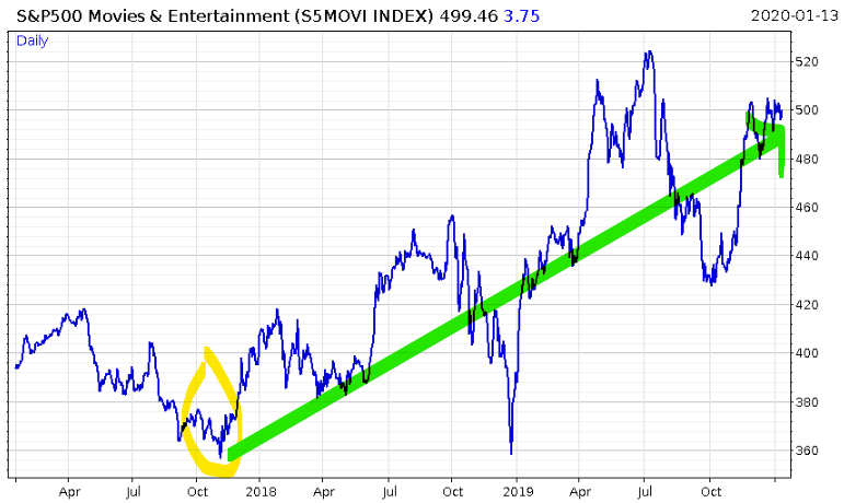 Indeed, even when the industry is riddled with scandal, the escaping reality business has been able to escape its own reality: when the Harvey Weinstein scandal began is the same time the S&P 500 Movies and Entertainment index started a thunderous rally!