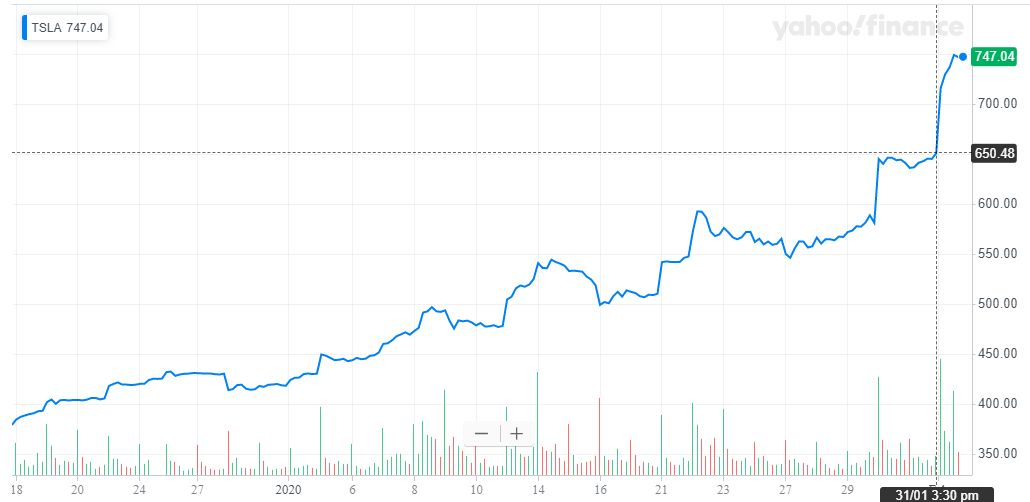 Noise of the commotion in the East doesn’t even appear to have reached the party in the US. The share price of Tesla ($TSLA), which reported it had burned some $800 million in 2019 last week, has rallied 14% since the announcement, rising almost $100 in share price at the time of writing: