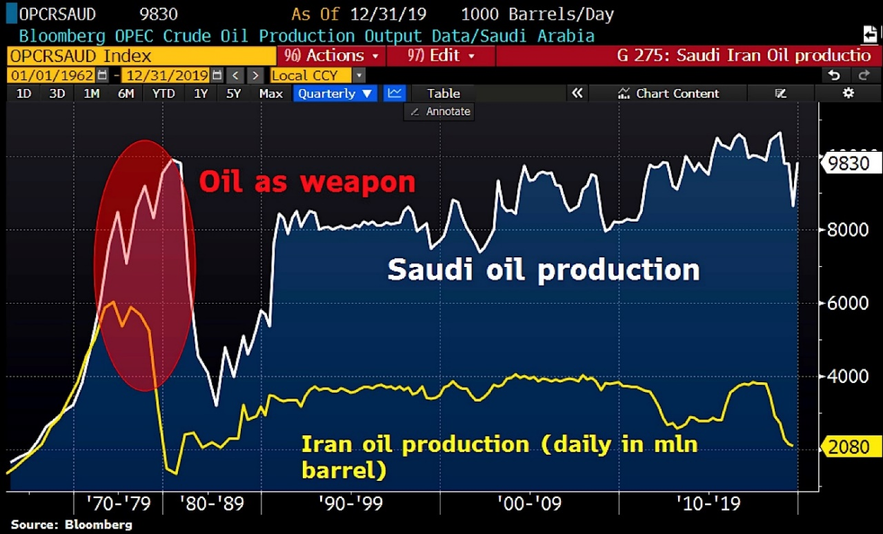 As you can see, the Saudis picked up Iran’s slack in the 1970s, and didn’t stop. While Saudi production hovers near 10 million barrels a day, Iran is in the doldrums at 2 million.