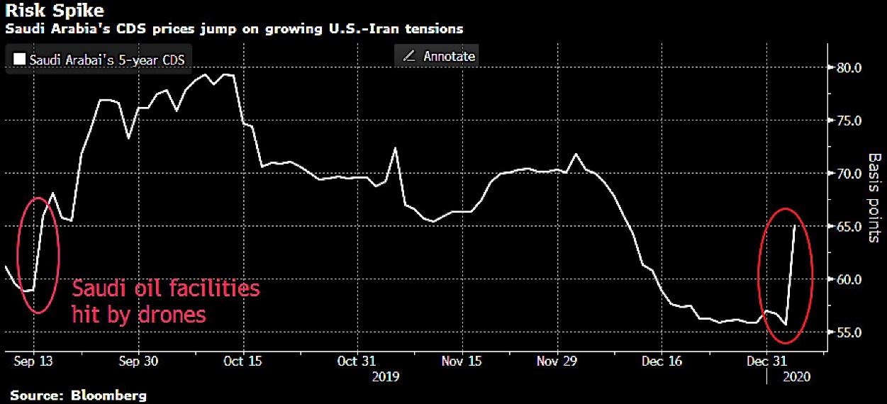 And interestingly, the drone strike on the IRGC general (who every journalist now knows everything about) has caused investors to fear a Saudi Arabian default more strongly than when their oil production was hit by Iranian developed drones last year: