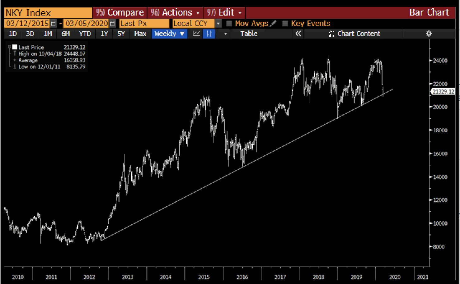 The Japanese stockmarket is now threatening to break down through a trend that has supported it for over a decade: