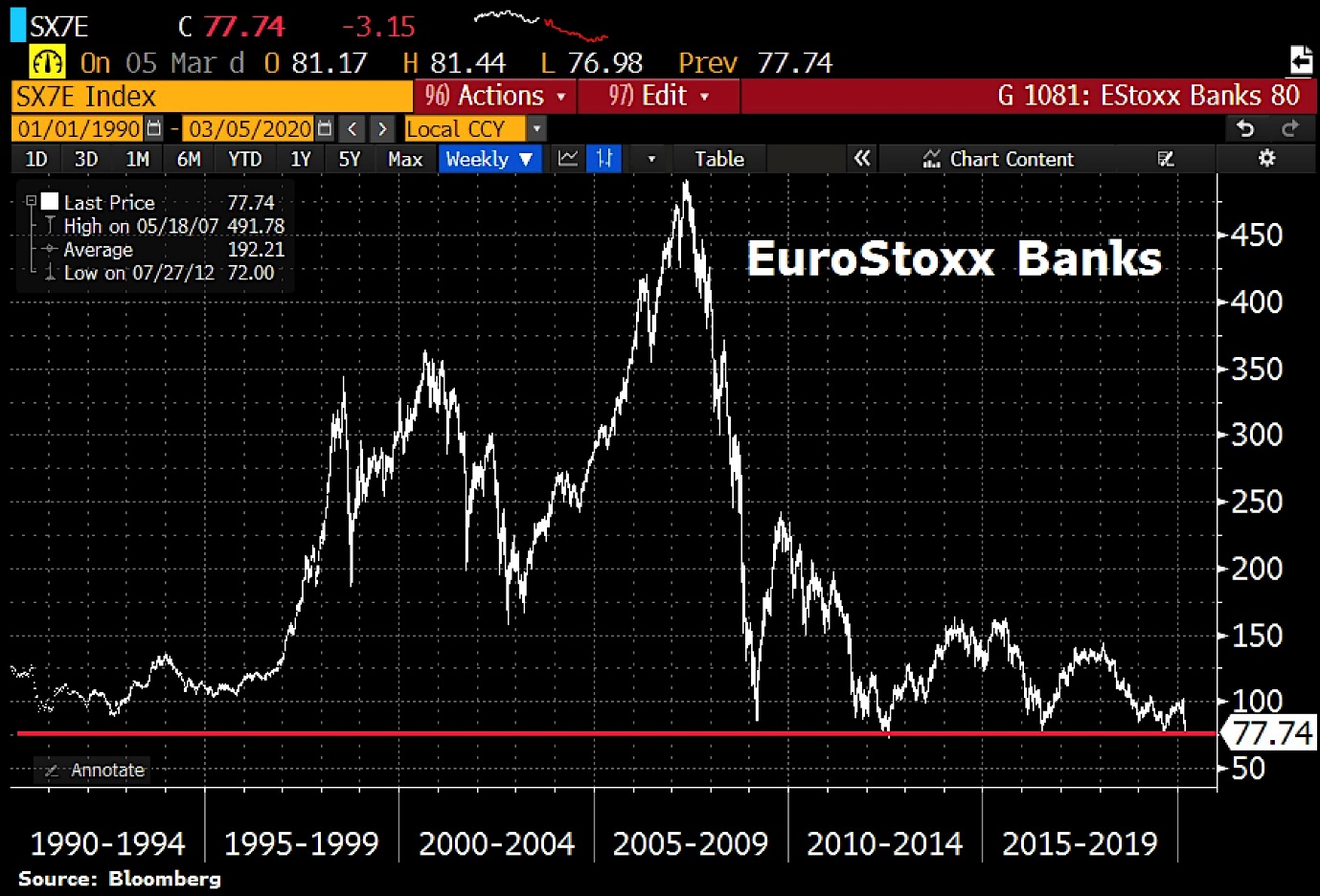 That door to salvation is shutting before our eyes. Remember the SX7E index? It’s the European banking index I told you to keep an eye on last year (The bank run in disguise – 12 August 2019). It’s now hitting its sovereign debt crisis lows: