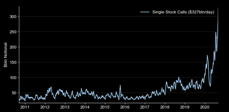 That attraction/addiction went nuclear this year. This is the daily traded interest in call options on individual stocks:
