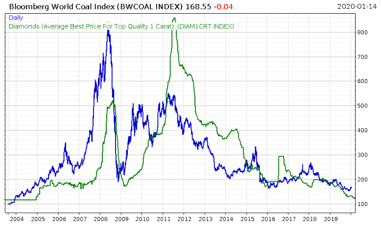 While diamonds have reacted with something of a lag, and with less or more intensity, they share the same broad direction, and in recent years that has been a grinding route downwards. Despite their massive differences in application, coal and diamonds have shared the same fate, though I’ve yet to hear diamonds be blamed for climate change.