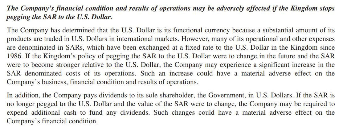 Interestingly, one risk listed was the possibility that the Saudi Arabian government would stop pegging its currency (the riyal), to the US dollar. Such a move would have huge implications for Saudi Arabia’s relationship with the US, which is itself a fulcrum on which the world order we live in today rests.